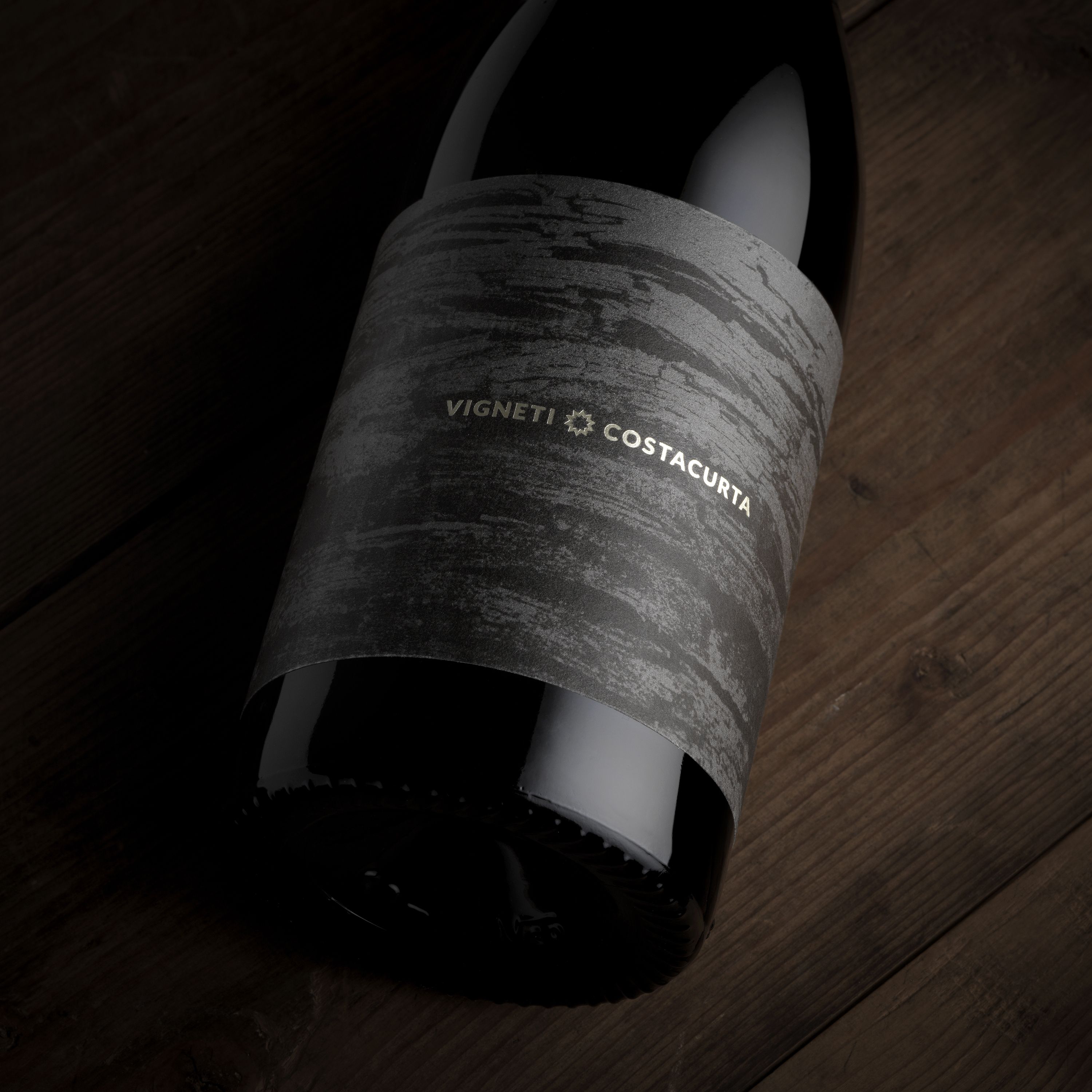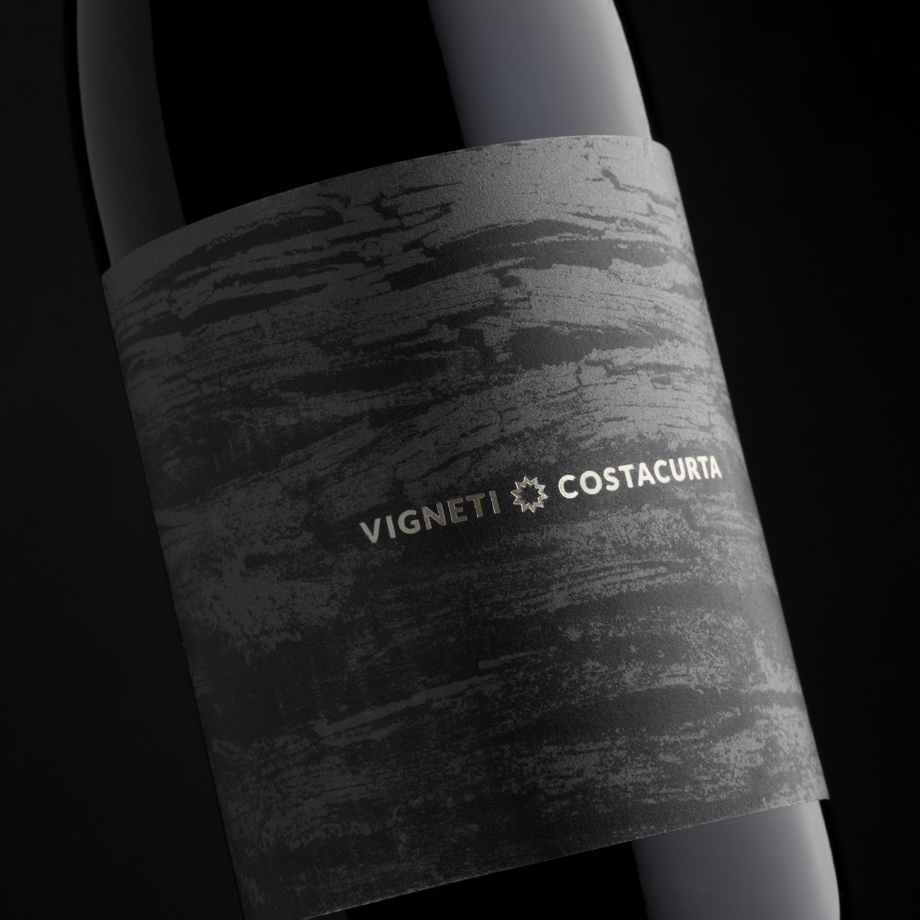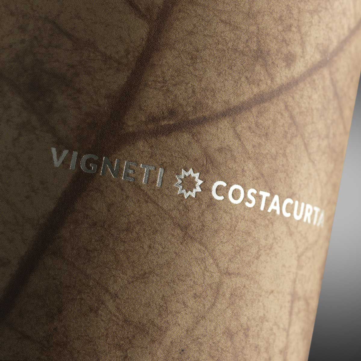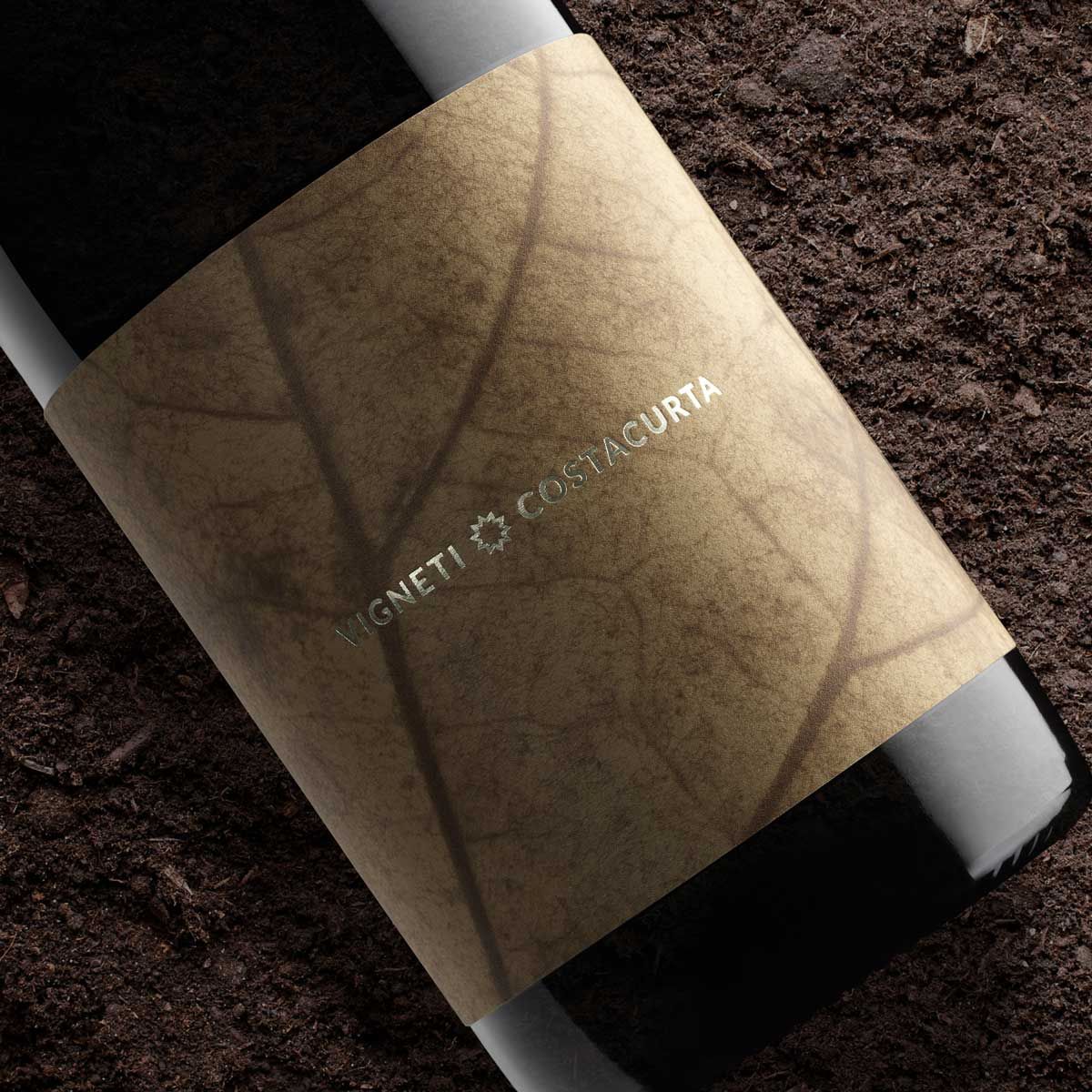 Ciascuna etichetta, pulita ed elegante, avvolge la bottiglia con una texture materica ricavata dalla scansione di una vera foglia dei vigneti Costacurta. La foglia cambia, di anno in anno e di vino in vino, come cambia lentamente la natura e il vino che la bottiglia contiene.
