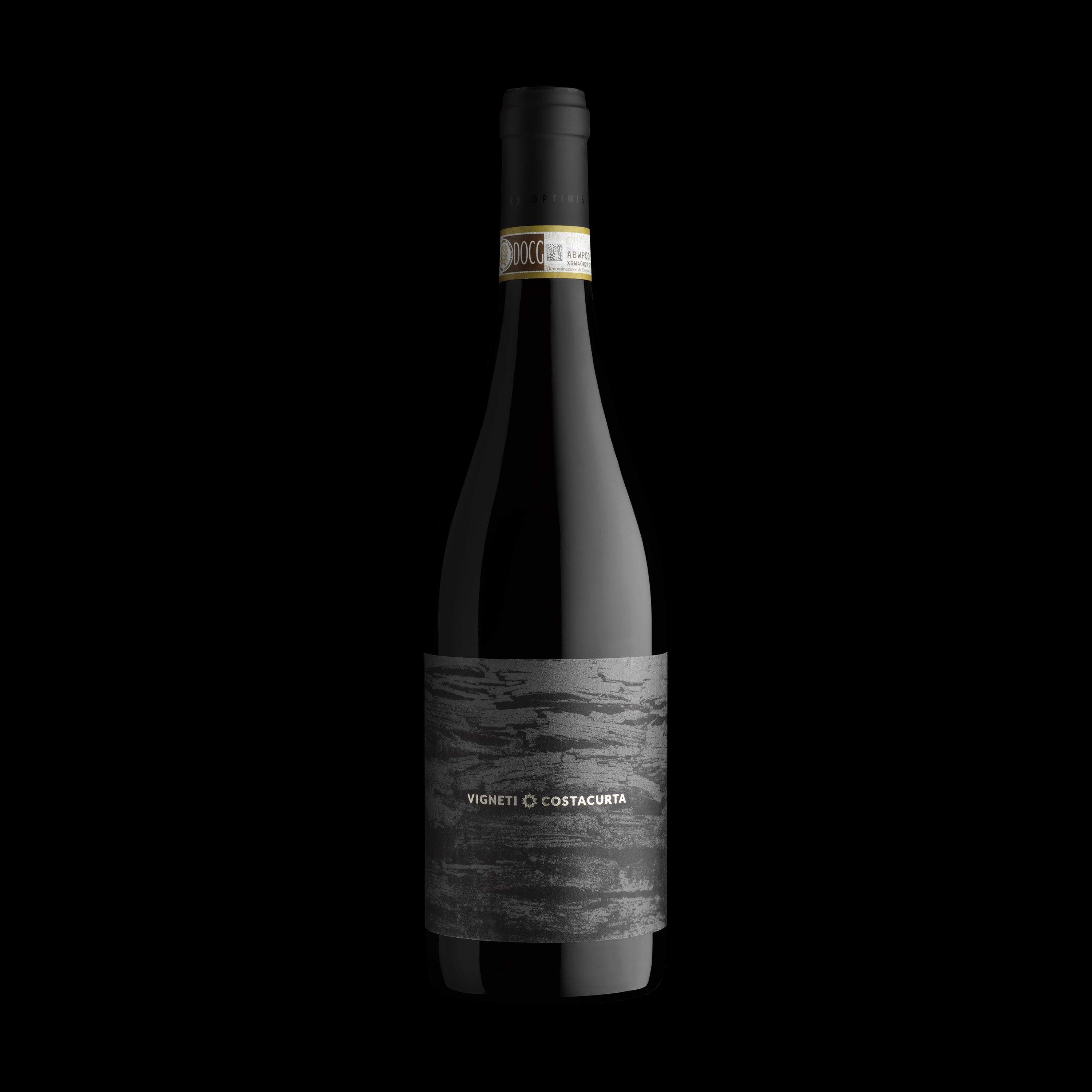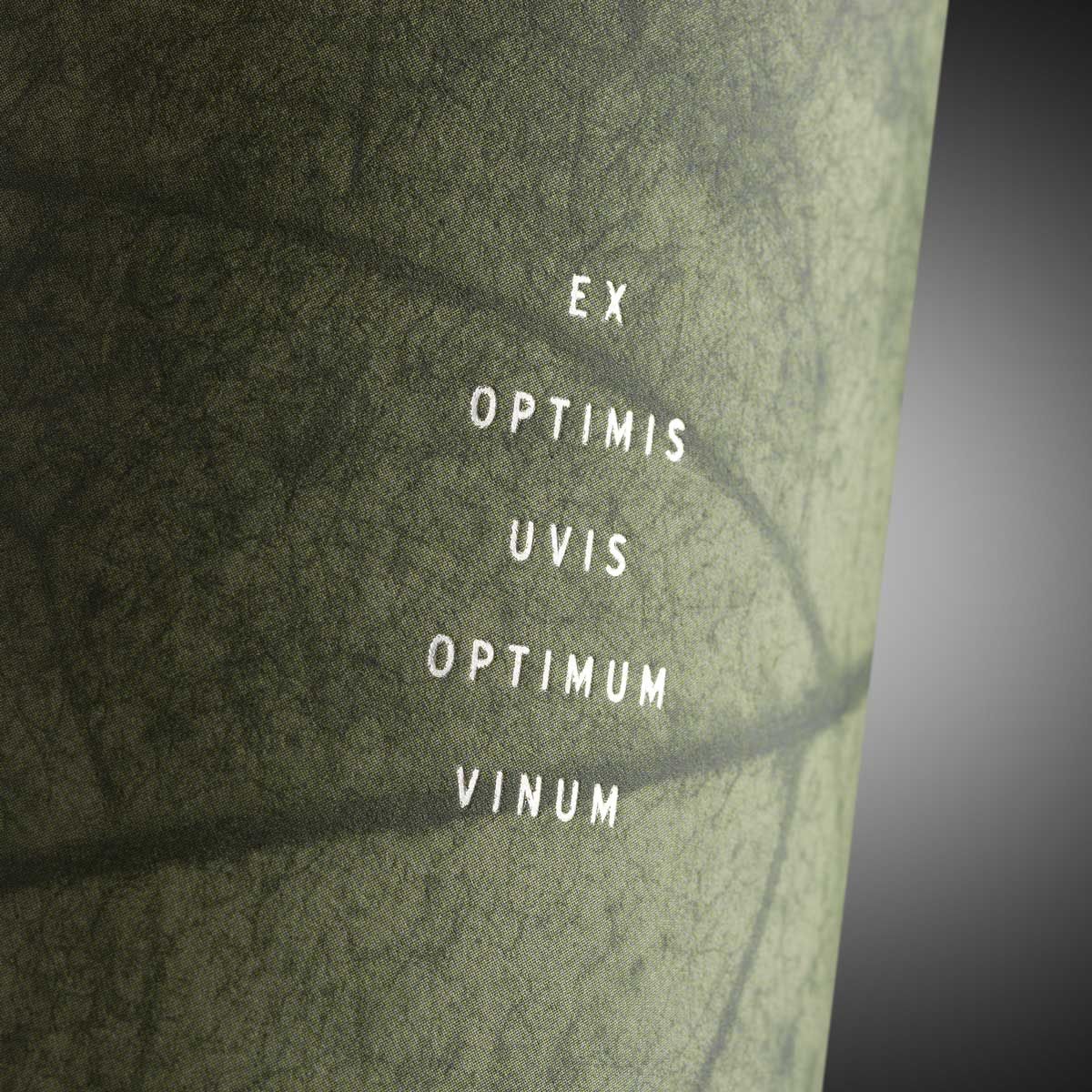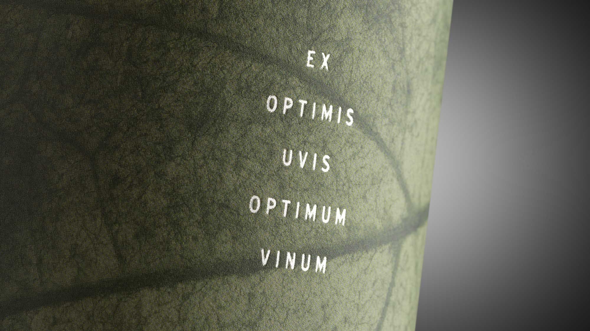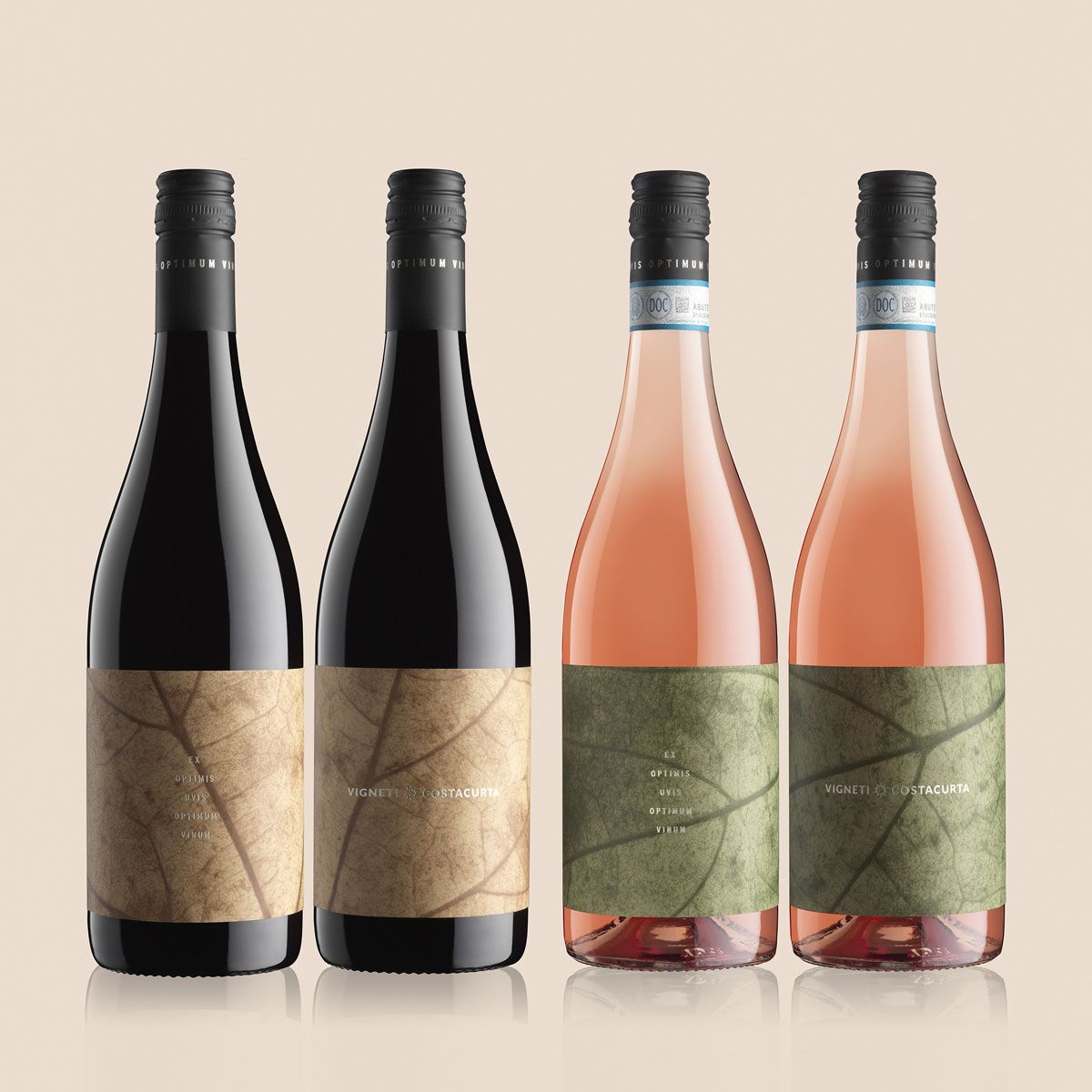Ciascuna etichetta, pulita ed elegante, avvolge la bottiglia con una texture materica ricavata dalla scansione di una vera foglia dei vigneti Costacurta. La foglia cambia, di anno in anno e di vino in vino, come cambia lentamente la natura e il vino che la bottiglia contiene.